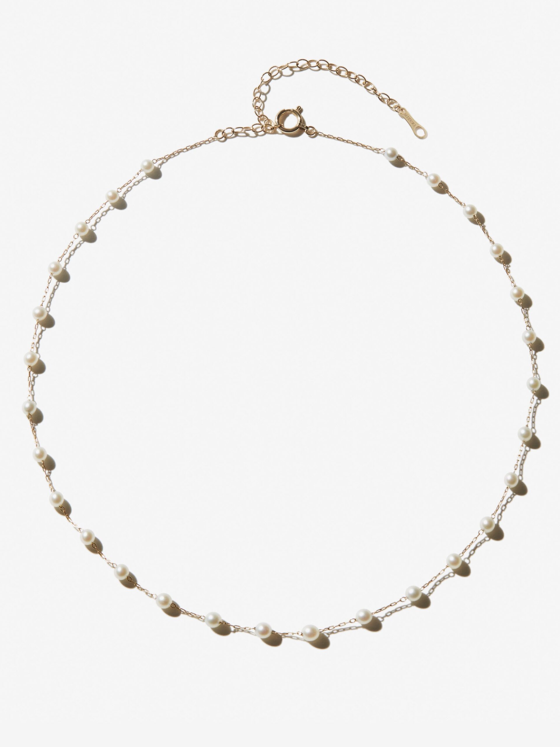 The pearl choker for today’s woman. A fresh modern vision with white pearls spaced along the gold chain. Its adjustable length lets you play with the look you want. It’s simple, beautiful and now.